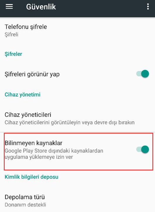 3. [Bilinmeyen Kaynaklar] butonunu, uygulamaların dış kaynaklardan yüklenmesine izin vermek için etkinleştir.